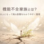 外から見ると普通に見える家庭でも、子どもが安心して過ごしにくい状態が続いていたなら、その影響が大人になってからも残ることがあります。この記事では、機能不全家族とは何かをやさしく整理しながら、どんな特徴があり、大人になってどのような影響が残りやすいのかをわかりやすく解説します。